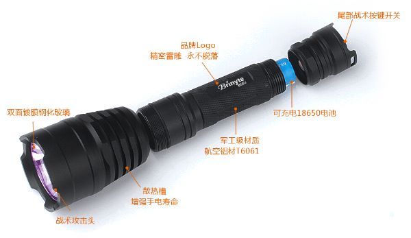 此款LED远射强光手电筒采用高品质T6061航空铝,经过军工三级硬质阳极氧化处理,外观不仅手感舒适,更能防刮花、耐腐蚀,经久耐用。