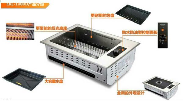 EKL-1000D远红外线无烟电烤炉,此电烤炉是根据红外线发热不会产生燃烧的废气和炭尘,保持室内新鲜清新空气的特点来研发和生产的。此电烤炉*大的特点是可以用远红外线发热体的装置维持一定的温度,使肉从内到外均匀烤熟,烤肉又嫩又不易干燥;可*大维持肉中蛋白质,碳水化合物等有益营养素的保持,是烧烤餐厅*理想的烧烤工具。