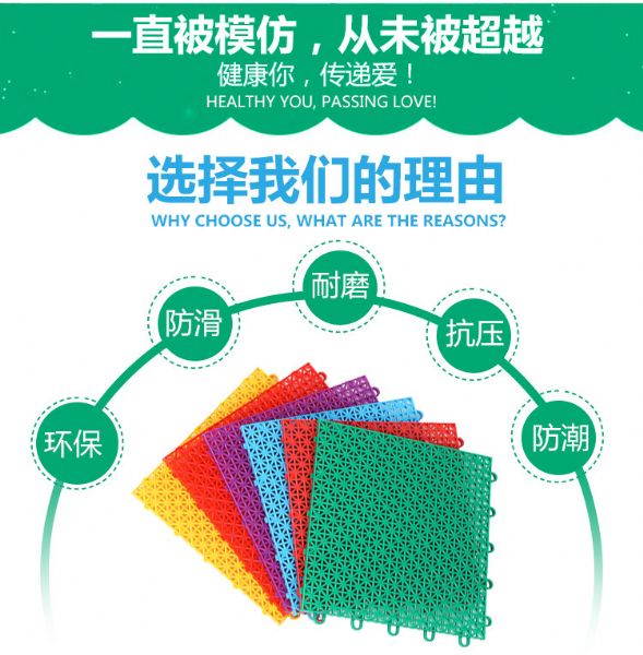 主要采用改性PP(聚丙烯)为原材料,由带锁扣的单块地板搭接拼装在一起的可作为运动之用的地板。它采用悬浮式的结构设计加上坚固的加强型支撑脚结构,创造卓越的垂直的减震效果,防滑的表面可有效防止运动损伤。具有环保、耐用、方便快捷、可移动、抗寒抗热抗老化、舒适、安全健康、运动性能卓越等特点,分休闲型和运动型,是新型的健康环保体育运动地板。 目前应用于国内各种体育场馆和幼儿园小学的游乐场及运动场地,逐渐发展成为体育场地改造及新建铺设和幼儿园运动场地的*用材。