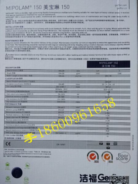 法国洁福美宝琳150同质透心地板符合EN649(34-43)质量标准,材料总厚度2mm,规格为20m*2m,防火等级B1,其耐磨达到K5(P类),抗化学性很好。该产品无DOP,无重金属,无苯,无甲醛,28天后TVOC排放量检测值小于10μg/m3,100%符合欧盟REACH法规,健康环保.适合于医疗、教育、商业、工业、交通、运动和办公场合的使用。