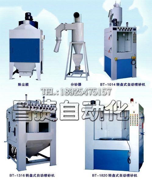 转盘式自动喷砂机有间歇转盘式自动喷砂机、连续转盘式自动喷砂机、自动台车转盘式喷砂机,固定转盘式自动喷砂机..