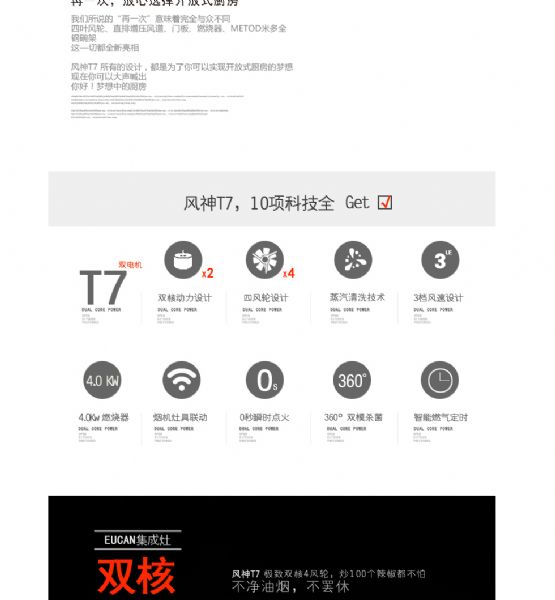 厨电品牌、售价 6990、双电机四风轮、特氟龙 / 蒸汽洗、极效燃烧系统、智能联动、叫T7。