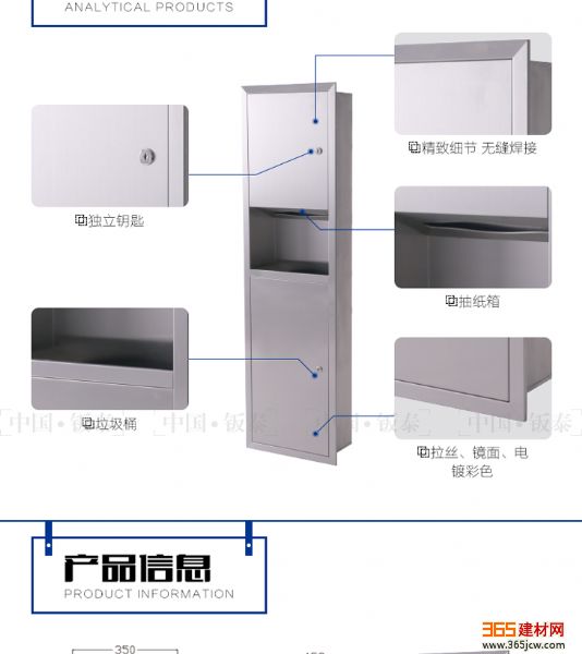 主营业务:不锈钢入墙式三合一组合柜,不锈钢烘手器,不锈钢垃圾桶,不锈钢入墙式二合一组合柜,不锈钢入墙式纸巾盒
