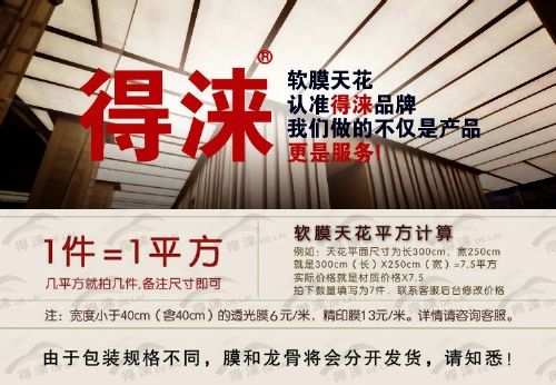 防火级为B1级的软膜天花卷材可用于广告灯箱 户内外广告灯箱 UV/写真喷绘 卡布灯箱膜超薄灯箱 灯箱广告 广告喷绘 墙体广告喷绘 软膜喷绘材料 LED灯箱 订做广告材料 灯箱广告牌 天花吊顶等等用途! 白色透光膜软膜天花卷材适合有喷绘机的广告公司,工程装饰公司,目前软膜正在快速普及各地的灯箱市场,软膜材料因其良好的透光性和画面表现力,已经开始大规模应用在展会、手机专卖店等广告灯箱。得涞软膜专业生产软膜天花卷材 UV/写真软膜喷绘加工 3P布/珍珠布/刀刮布等UV喷绘卡布广告灯箱制作一站式服务!
