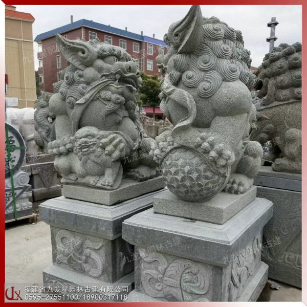 本对石狮子锈球造型别致精美,雄狮戏球,雌狮怀抱幼狮. 寓意吉祥富贵,子孙万代,适合庭院居家装饰摆放。