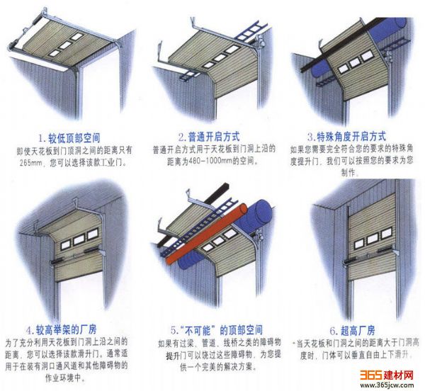 工业滑升门:工业滑升门由一系列门板组成,沿轨道上升,由扭簧系统或配重系统来保障门体平衡,安装轨道尽量贴近建筑物内侧,从而可以大量的节约建筑物的内部空间,将根据您建筑物的大小和形状,其提升门可以被设计成不同的安装方式。门体提升方式的选择可以基于以下基本条件:门洞大小;门洞上部空间;门洞侧部空间;门洞深度。根据建筑物现场的实际情况,结合业主方对空间的使用要求,可以实现以下几种提升方式。