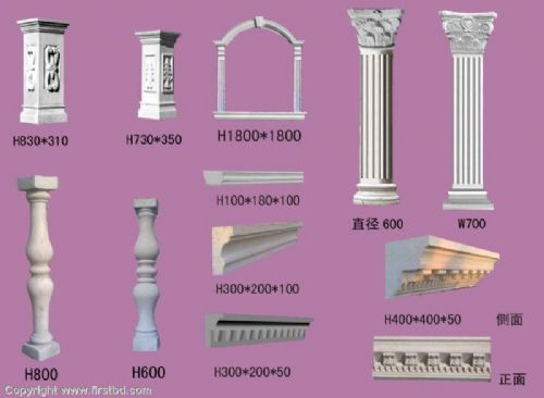 GRC装饰构件包括:GRC罗马柱、GRC檐线、GRC装饰线条、GRC斗拱、GRC门窗套、GRC浮雕,GR..