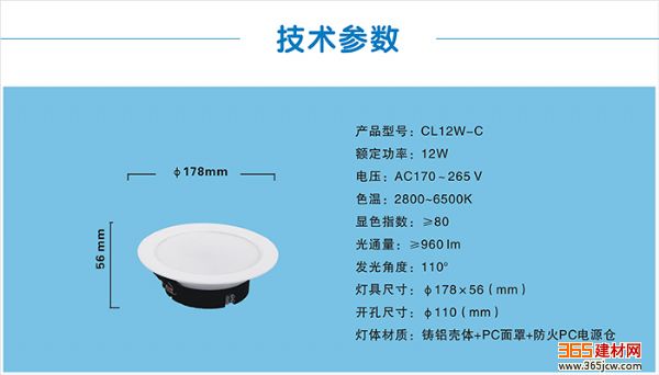 技术指标:额定功率12W;光通量≥960Lm;显色指数≥80;色温 4000K(2800~6500K可选)±300K;材质:压铸铝散热+PC罩+防火PC电源仓;外形尺寸: 5吋,φ178×50mm;开口尺寸:φ155mm;净重0.329Kg。