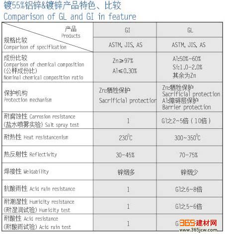 “镀55%铝锌彩钢板”之铝锌合金结构是由约55%铝、43.4%锌与1.6%硅在600°C高温下固化而组成,其整个结构由铝-铁-硅-锌,形成致密的四元结晶体,此结晶体在钢板上形成一层屏障,因而有效的防止腐蚀因子穿透。