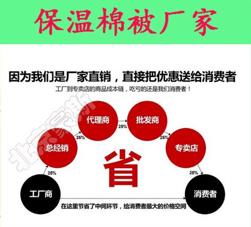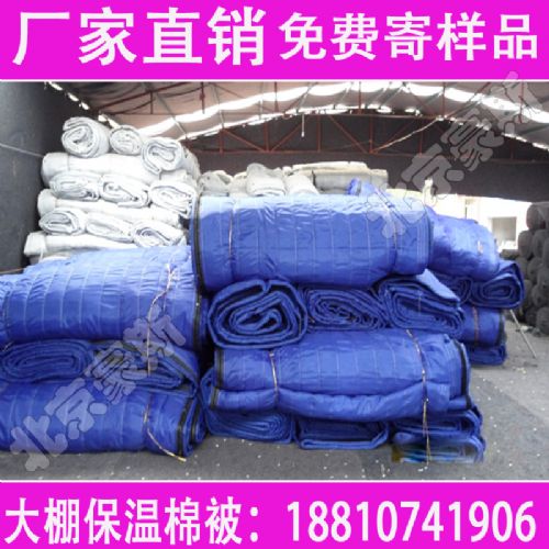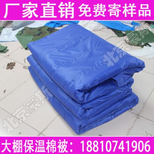 牛津布面料:产品两面采用牛津布,中间两层防寒毡,一层棉(可以加厚)。保温系数:室外-30摄氏度,室内6摄氏度(注:该温度为大庆43型棚,不生火,36小时不掀被时所测定)。行距为20厘米,针距为1.2厘米,尼龙线,牛津布具备抗老化,耐辐射的特点,防寒毡内加编织袋,耐拉,防雨,棉花不少于15斤。质地柔软,绿色产品。重量为2.5斤/平米,寿命长达2-3年。 - 北京豪斯商贸有限公司