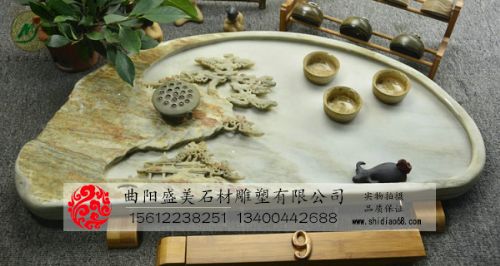 石雕茶台大部分用大理石与实木架为主,也有一些石板材制作,主要适合家居办公会客、礼赠亲朋好友,台面与架子可以移动分开,不是一体化的。集消毒、泡茶、抽水、排化一体化,可以方便快捷的泡茶。又叫功夫茶台、功能茶台、智能型茶台。 - 曲阳县盛美石材雕塑有限公司