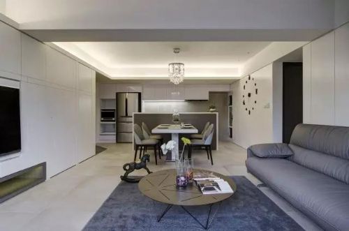 今天为大家带来的是名匠世家优秀设计师李波设计的作品现代灰白简约。屋内以灰色和白色为基础的色调,然后加以少量的黑色以点缀。整体给人现代的明朗简约,大气而不失品位的设计。透明的水晶吊灯在餐厅的上方,也给这一次清冷带来一丝丝的绚丽,墙上的巨大无边框的钟表,极具设计感茶几、整体的衣柜、简约的电视墙,这里每一处显示着设计师的用心和强大的设计功力。