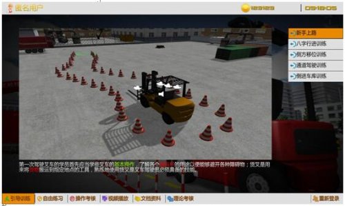 叉车仿真实训教程有:引导训练、自由练习、操作考核、视频播放、文档资料、理论考核等。