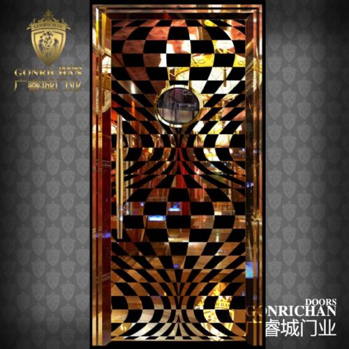 玫瑰金拉丝不锈钢KTV大门是利用304#201#不锈钢板为基材,对其表面进行镜面,拉丝,蚀刻,焊接,抛光..