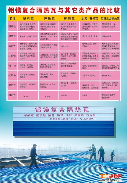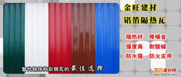 因具有耐酸碱抗腐蚀防火的特点。它可广凡用于钢厂、硫酸厂、陶瓷厂、焦化厂、铸造厂、污水处理、大型锅炉房、砖厂等。因有隔热隔音下雨无澡音还可用于大型车间厂房,完全可以替代钢结构彩钢瓦工程。彩钢夹心板瓦价格在40~80元/㎡甚至更高,而铝镁隔热瓦每平米只有30元以内价格。可做墙体。综上所述此瓦物美价廉,也是近几年屋面各种防水瓦的佼佼者,是广大企业家老总们建设厂房明智的选择。 - 新泰市金旺建筑材料有限公司
