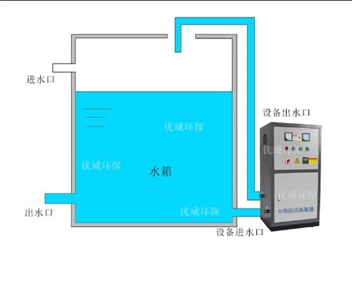 外置式水箱自洁消毒器由三部分组成,输送管道系统、臭氧发生系统及汽水混合系统