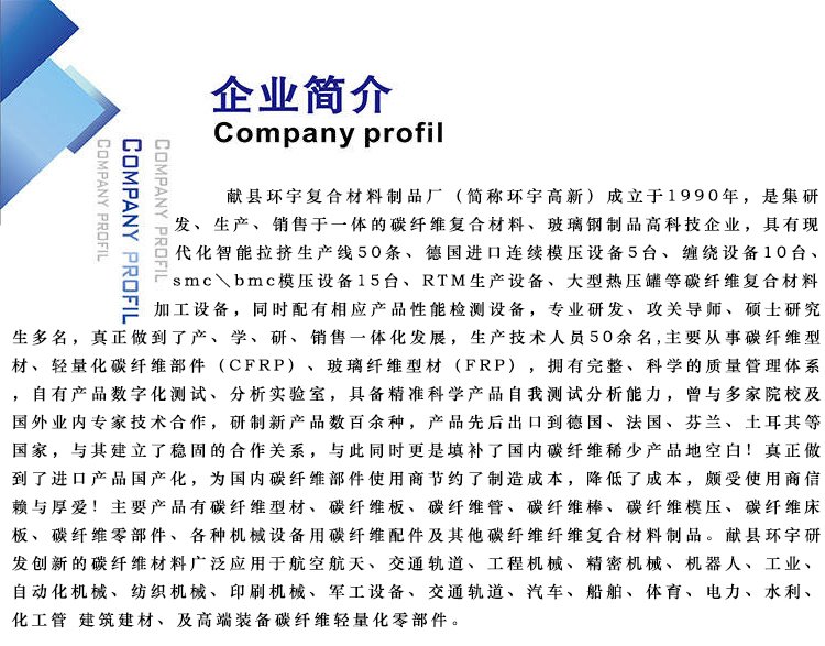主营业务:碳纤维管、碳纤维棒、碳纤维板、碳纤维型材、碳纤维部件、碳纤维加固板、风力发电机叶片、玻璃纤维型材
