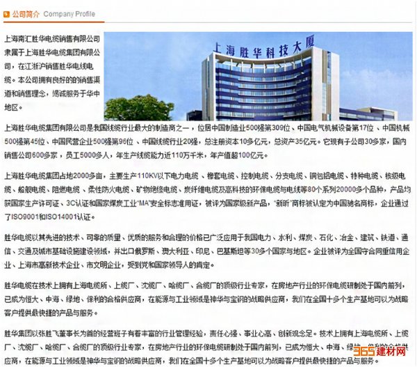 上海胜华电缆集团---是我国线缆行业*大的制造商之一,拥有子公司30多家,国内销售公司和办事处600多家,位居中国机械500强第49位、中国制造业500强第309位,总注册资本10亿多元,总资产35亿元,年产值120多亿元,近几年来集团增加了资金投入陆续收购了合肥电缆厂、哈尔滨电缆厂、河南新乡电缆厂、宁夏东风电缆厂、沈阳开元电缆厂,并重组成立了中国绿宝电缆集团、哈尔滨电缆集团、河南胜华电缆集团、宁夏胜华电缆有限公司、辽宁胜华电缆有限公司,形成了以上海总部为核心的辐射全国的6大线缆生产基地。并在上海成立了如:胜华特种线缆有限公司、胜华碳纤维线缆有限公司、胜华核级电缆有限公司、胜华电气股份有限公司等高新子公司,专门从事某一领域线缆产品的研发和推广工作。