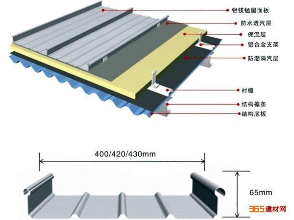 铝镁锰直立锁边金属屋面65-400型 0.7mm铝镁锰屋面板 PE 、PVDF漆 详细资料如下: 铝镁..