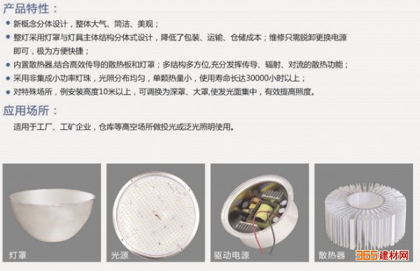 适用于工厂、工矿企业,仓库等室内高空场所做投光或泛光照明使用。