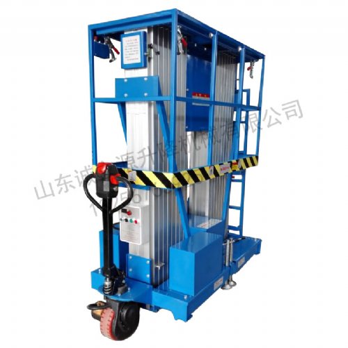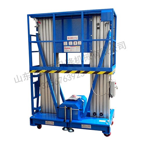 两组桅柱支撑作业平台同步升降,铝合金升降机具有优秀的工作稳定性;整体升降式护栏装置,强度好,运输时大幅度地降低整机高度,装卸十分方便,通过一次升降即可完成装配或拆卸;可配加龙门跨架;具有单桅柱同样的方便的机动灵活性,支退结构同单桅柱式平台;有较好的承载能力,适合于不超过两人同时登高作业。