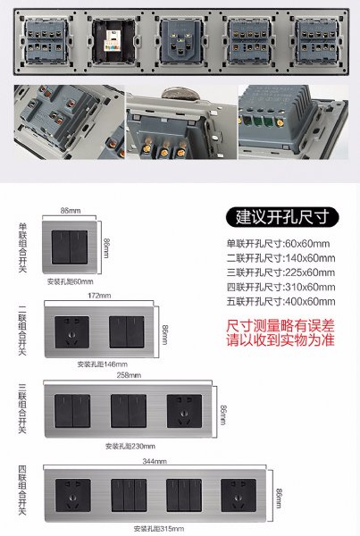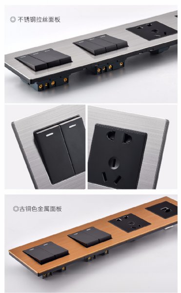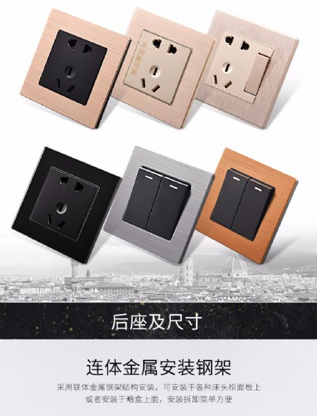 4.墙壁开关产品整体模块、内嵌钢板、大气的外观、适用更加安全、安装更加方便。