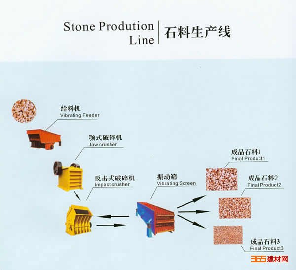 不满足粒度要求的石子返料进反击式破碎机再次破碎。大块石料经料仓由振动给料机均