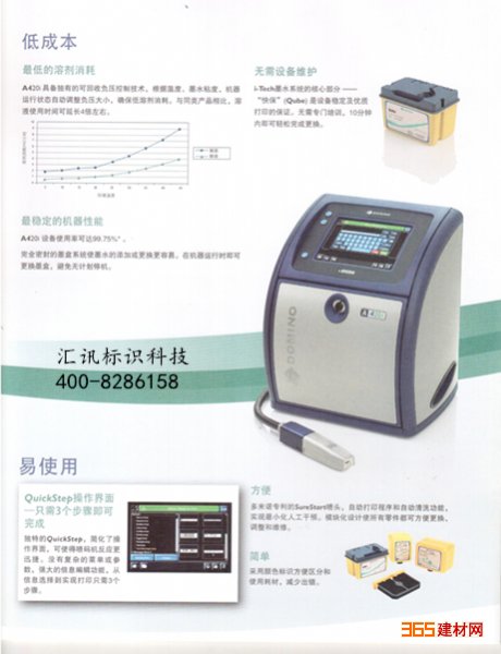 多米诺A420i连续喷墨 (CIJ)标识解决方案,采用稀释液消耗超低的智能“快保(Qube)”墨水系统,大幅降低耗材成本并*大限度减少人工干预,实现设备“零维护”。配合全面升级的“速达(SureStart)”喷头,进而将喷墨标识设备的综合使用成本降至*低。此外,公司开发了多款同一系列新产品,以满足多种应用及苛刻的生产环境需求。A420i现已成为市面上维护保养*便捷、性能*稳定、使用成本*低的喷墨标识设备。