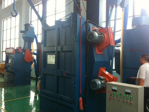 履带式抛丸机简介: 在清理室中加入规定数量的工件,机器启动后,工件被滚筒带动,开始翻转。同时抛丸器高速抛..