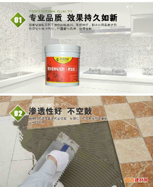 1、铺贴各种材质型号规格的瓷砖,尤其是对玻化砖的粘结效果更好,适合家庭装修的卫生间、厨房、阳台等部位的瓷砖以及楼道公共部位的瓷砖粘贴。