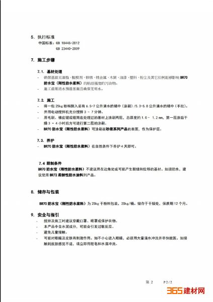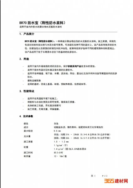 BR70防水宝(刚性防水浆料):一种单组分聚合物改性的水泥基防水涂料,施工简便,将预先包装好的粉料按比例与水混合即可使用,可涂刷在各种不同的基材上。该产品具有优异的防水性、防腐蚀性以及很强的耐候性和抗冲击性,能够有效保护各种不同的建筑物和结构混凝土。该产品适用于处于长期浸水状态下的基材的抗渗防水。