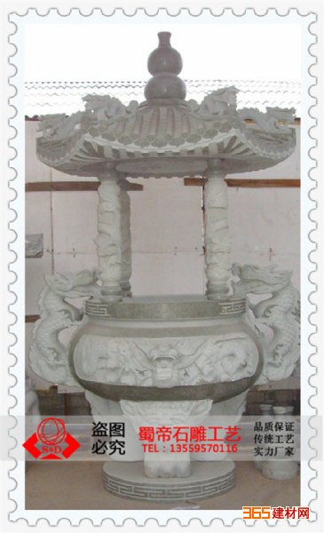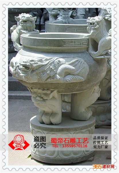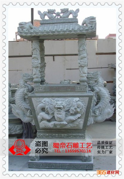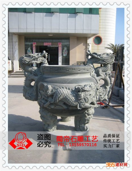 石雕香炉采用优质青石精雕细琢而成。香炉的两边的龙栩栩如生。石雕香炉的作用,是盛载香支,以作日常供奉神明之用。香炉亦分两大类,一是瓷器造的香炉,另一种是石质的香炉,两者作用略有不同。瓷器的香妒,因为是土器制品,较适宜与地界作沟通可供奉地界神明之用,譬如供奉祖先或土地、地主财神等、宜用瓷器制的香炉,这一种炉却不宜用于供奉天界的神祗。天界与地界宜分清楚,因为天界上的是天神,佛菩萨,是具有无上的威力。而地界所供奉的却是阴灵,不可与天界的神祗混而为一,两者要有区别。天界供奉时所用的香炉,却宜用铜制的那一种,自古代以来,历代帝皇向天祭祀时所用的炉,都是石雕制造,香炉却就不宜用于供土地,祷告祖先等地界神祗。