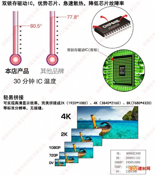 1.高亮度超清晰无死灯 百屏联动同步播放 2.进口LED高亮灯珠,寿命达10万小时。电流均匀,稳..