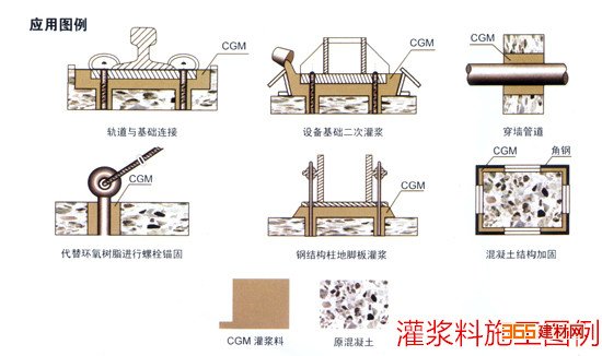 灌浆厚度30mm<δ<150mm设备基础二次灌浆,地脚螺栓锚固,栽埋钢筋,建筑物梁,板,柱,基础和地坪的补强加固。