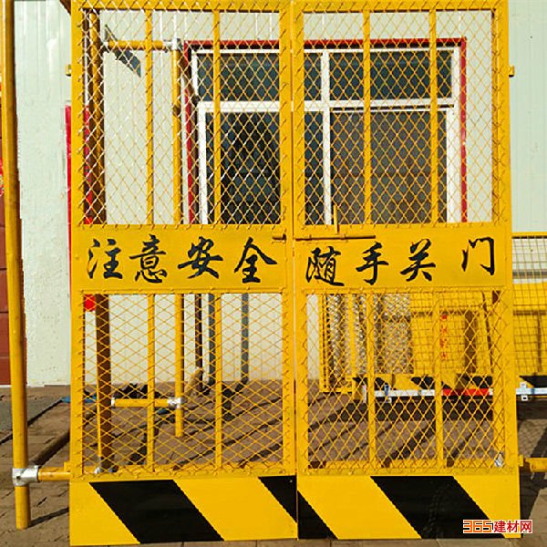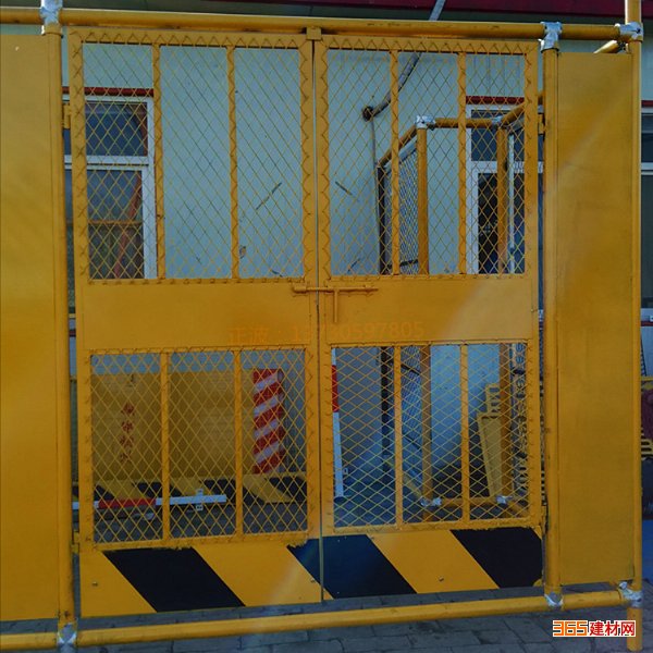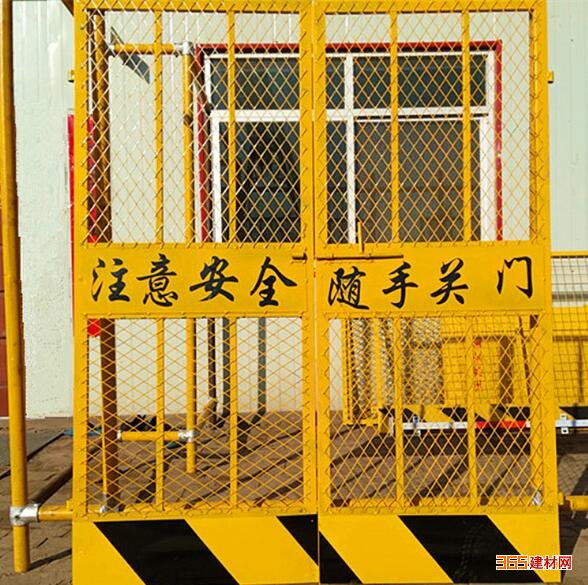 门面采用小孔钢板网或电焊网片与钢板组合构成。一方面可以防止等候人员伸手开门,又便于人货电梯操作人员观察楼内情况,利于楼内外双方工作人员沟通交流。高强冷轧钢板同时也是小型汽车普遍采用的材料,可以抗击300kg以上的冲击力,并且喷涂警示语和挡脚警示线,对工地文明施工形象显著提升。