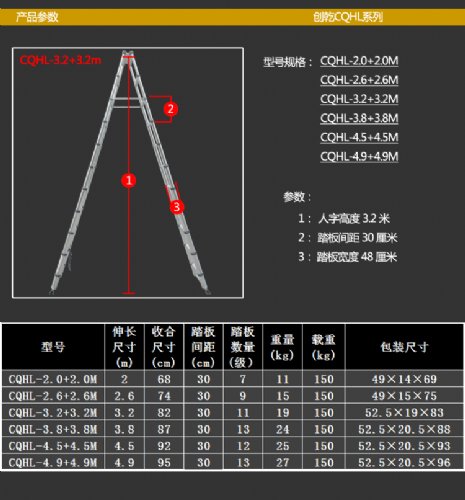 CQHL-3.2+3.2M 总高3.2米 人字高3.2米 缩后高80厘米 重量21.2KG