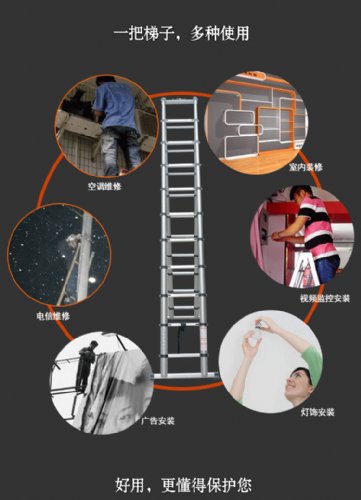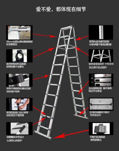 厂家直销特厚铝型材料,每一节圆管都要比别人要长8CM,特殊尼龙塑料配件固定,让梯子更安全稳固。*少承重150KG.