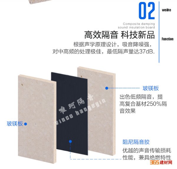 采用两块高密度防火玻镁板夹一块高沾滞性沥青毡复合加工而成。玻镁平板(俗称 氧化镁板)是以氧化镁,氯化镁,和水三元体系,经配置和加改性剂而制成的,性能稳定的镁质胶凝材料,以中碱性玻纤网为增强材料,以轻质材料为填充物复合而 成的新型不燃性装饰材料 。 采用特殊生产工艺加工而成,具有防火、防水、无味、*、不冻、不腐、不裂、不变、不燃、高强质轻等优点。沥青材料是由不同 分子量的碳氢化合物及其非金属衍生物组成的黑褐色复杂混合物,具有防水防潮和防腐的性能。玻镁沥青隔声板集中了玻镁材料和沥青材料的优点,性能更佳。