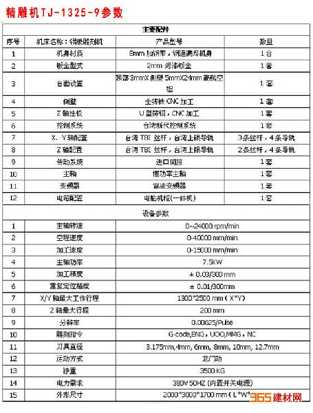 1325方轨齿条机产品配置表 台面尺寸 1300*2500mm 驱动器 860*4 主轴电机 3.5K..