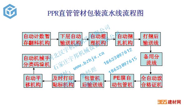 三、PVC线管自动化包装流水线:流程说明: 实现自动计数接料暂存翻料、输送、自动机械手整理,自动小袋包装(塑料膜袋)、自动机械分类暂存、自动打捆放合格证、全自动套大袋(编织袋)、自动机械码垛等功能--自动及时打印规格、型号、直径、班组自动打捆、批次等可追溯功能。 - 石家庄宇邦机械设备有限公司