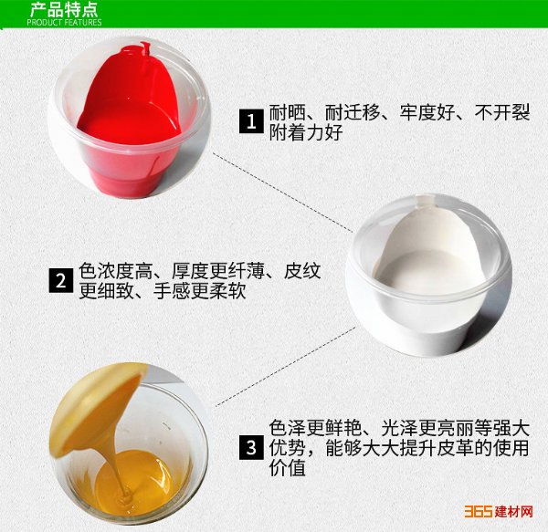 具有:耐晒、耐迁移、牢度好、不开裂、附着力好、色浓度高、厚度更纤薄、皮纹更细致、手感更柔软、色泽更鲜艳、光泽更亮丽等强大优势,能够大大提升皮革的使用价值!!!