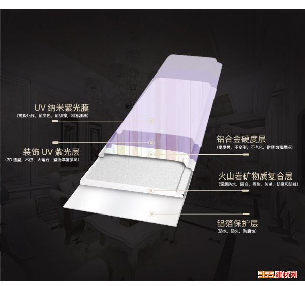 采用新型材料火山岩,天然胶凝材料和铝板通过高温工艺复合而成,防火等级达到普通装饰材料不具备的A级防火,纯环保,0甲醛,不含重金属,无放射性,无挥发物,保温,隔音,防水,防潮性能优越,板表面可湿水,可擦洗,易清洁。