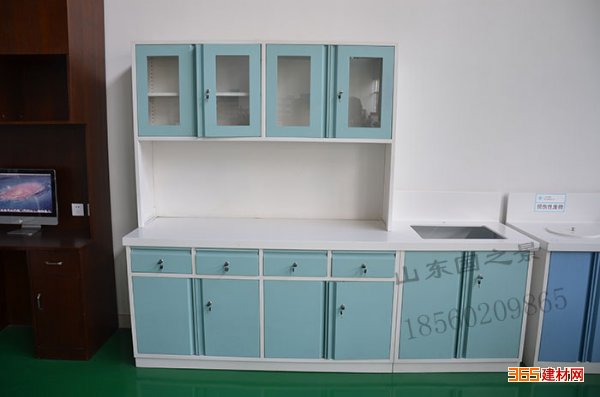 工艺:整体采用电阻焊接工艺,没有外露焊点。柜体需全封闭顶板,以加强台面支撑,柜体正面门及抽屉间空隙在1.0-1.5mm之间,柜体边框宽度为2.5cm,采用双层门板设计,内嵌门板工艺,柜门打开角度达到90度,并且内有加强筋,提高门的使用寿命,活动层板四边折弯,可自由调节高度,层板挂钩采用2.0厚,可自由拆卸,逐级调整高度,层板加强筋可承受50KG.采用隐藏式卷边拉手,折弯一体成型。柜门内置磁吸功能,与柜体的贴合更加紧密。柜门采用门轴连接方式,门轴连接件为4.0mm。 5.配置:处置室由水槽柜、无菌辅料柜、脚踏污物柜组成,其中污物柜内置ABS污物桶。