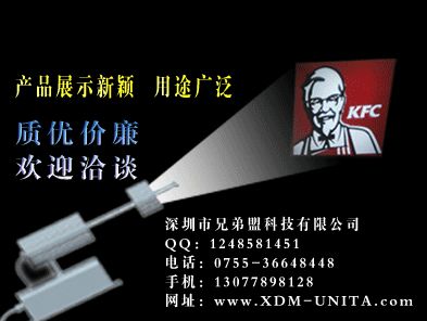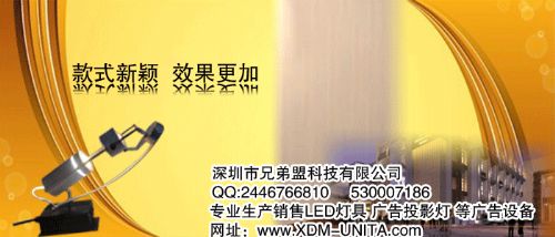 深圳市兄弟盟科技有限公司供应专门用于投影广告的效果灯,功率小,亮度高,效果好,广泛应用于各大卖场,展会、酒店、茶馆、商场、服装专卖店、酒吧(城市夜景、地标、主题广场,以及城市亮化美化工程),或投影于街道地面或楼体墙面、广场等等。可以投影单图案或多图案,有图案转动,图案静态的,此种广告方式新颖,吸引眼光,且投放成本低,市场潜力巨大,本司从事此行业时间长,经验足,价格优,欢迎前来咨询洽谈。