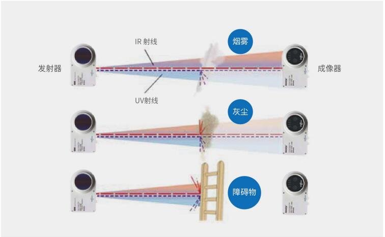 因阳光、反射阳光或任何其他非常明亮的光源照射而饱和时,探测器不会发出报警。恶略情况下,探测器进入故障状态,从而解决了传统的采用光电管型接收器线型光束探测器虚假报警的另一个原因。