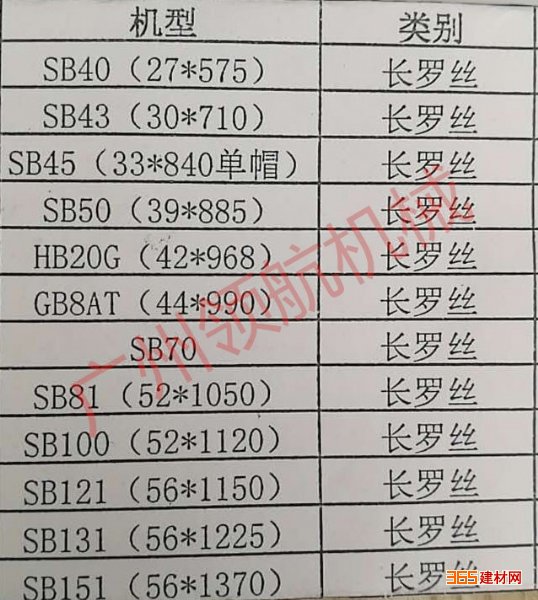 型号:SB40长罗丝27×575/SB43长罗丝30×710/SB45长罗丝33×840单帽/SB50长罗丝39×885/HB20G长罗丝42×968