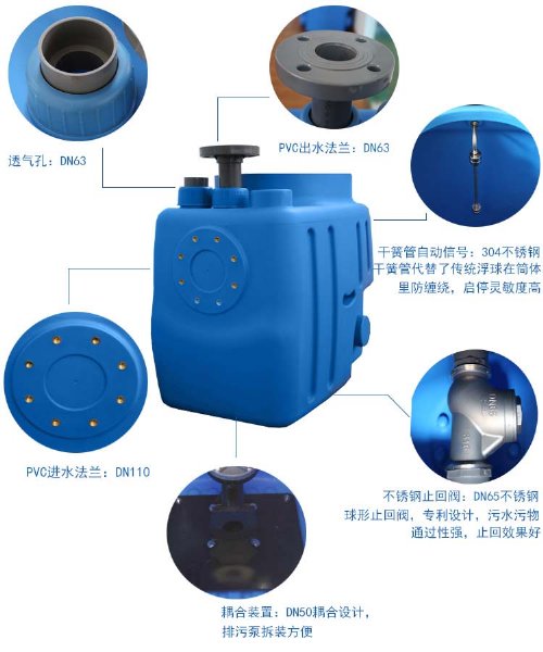 SNY污水提升器是一种专门用于污水量和杂物量较少的地下污水排放设备,主要由PE材质集水箱、铰刀泵、止回阀、排气口、污水的进、出口、放空口以及自动耦合装置组成。运行原理如下: