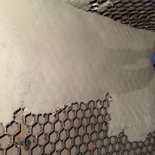 简介:耐磨陶瓷涂料采用磷酸盐溶液作结合剂,配刚玉骨料、刚玉粉、α-Al2O3,SiC微粉、超微粉及多种外加剂,施工完毕后可直接点火生产的新型耐磨耐火涂抹料。它具有附着力强,耐磨损,耐化学侵蚀,抗剥落,养护时间短,可与各种耐火材料结合等优点。 一、 包装 耐磨陶瓷涂料为25kg/袋包装,内置塑料袋小包装促凝剂(用以调节可塑料初凝时间),同时配桶装磷酸盐溶液作结合剂,加入量为袋装粉料的12%左右。 二、 贮存 耐磨陶瓷涂料必须存放在干燥库房内,不得雨淋,受潮,保质期为12个月。 三、 施工说明 1、搅拌准备:采用强制搅拌机拌和,所有搅拌工具必须清洁,不得混有泥沙、石灰、硅酸盐水泥等杂物。 2、促凝剂加入,根据施工环境温度,选择促凝剂合适加入量。温度小于20℃时,促凝剂可全部加入;大于20℃时可根据施工时间要求,适当调节促凝剂加入量。 3、搅拌:每次搅拌以加入4-6袋100-150公斤耐磨陶瓷涂料为宜,然后加入促凝剂干混2分钟,而后加入磷酸盐溶液12-18公斤左右,搅拌成“面团状”,有塑性时方可放料使用。 4、施工:将施工部位清理干净,内壁不得粘有杂物浮尘。首先清理龟甲网或扒钉上面浮着物,清干净施工工作面浮尘、杂物、然后用手工涂抹耐磨陶瓷涂料,施工部位可用铁板等工具弄平整、光滑、接口要紧密。对于施工面积较大或厚度大于50mm以上部位要加焊锚固件,且间距不大于50mm。 5、待耐磨陶瓷涂料初凝后,自然养护24小时以后施工部位即可移动,同时也可以点火生产。 6、该耐磨陶瓷涂料可与各种浇注料、耐火砖紧密结合。 7、此材料不得与其它任何浇注料混合使用,已初凝耐磨涂料不能再加胶水搅拌使用,应废弃。 8、该耐磨陶瓷涂料施工完毕初凝后,无需养护、烘烤、直接点火升温使用,且不影响其使用性能