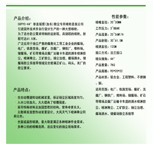 防尘喷枪厂家LS50PYC44度(加长)雾化喷雾除尘喷枪是我公司引进国外技术并自行设计生产的一种大型喷枪,为了适合防尘需求特制的远射程,高扬程的喷枪,防尘喷枪厂家LS50PYC44度(加长)雾化喷雾除尘喷枪喷射距离远,可0°-360°随意调整喷枪的旋转角度,在喷射过程中完全自动平稳的旋转喷射,无需人工干预。防尘喷枪厂家LS50PYC44度(加长)雾化喷雾除尘喷枪广泛应用于扬尘严重的煤焦化工等工业企业的煤场,电厂,铁路货场,煤矿,洗煤厂,钢铁厂,堆料场,储煤场,矿石等堆场及煤厂运输卡车道的洒水喷淋防尘,喷淋降尘,工矿防尘,扬尘治理,煤场除尘,储煤场防尘系统等领域,完全能满足矿山,码头,灰厂的防尘要求。
