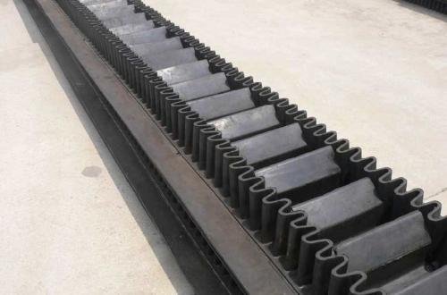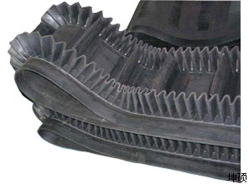 大倾角挡边胶带一共分三部分组成:1:基带 2:裙边 3:隔板。基带也分三种组成:棉帆布(CC),聚酯布(EP),尼龙布(NN)。裙边也叫波状挡边,可根据客户的需求订做不同的高度。裙边高度大于160mm时,我们嫩建议加固裙边螺栓,更好的增强裙边与隔板的牢固性。隔板一般分为T型,C型,TC型, TS型,TCS型,我们常用的一般是TC型,能满足物料不是很重倾斜角度90°内的物料输送。TS型跟TCS型,是加固螺栓固定隔板,一般用于输送重点的物料,不容易脱落。